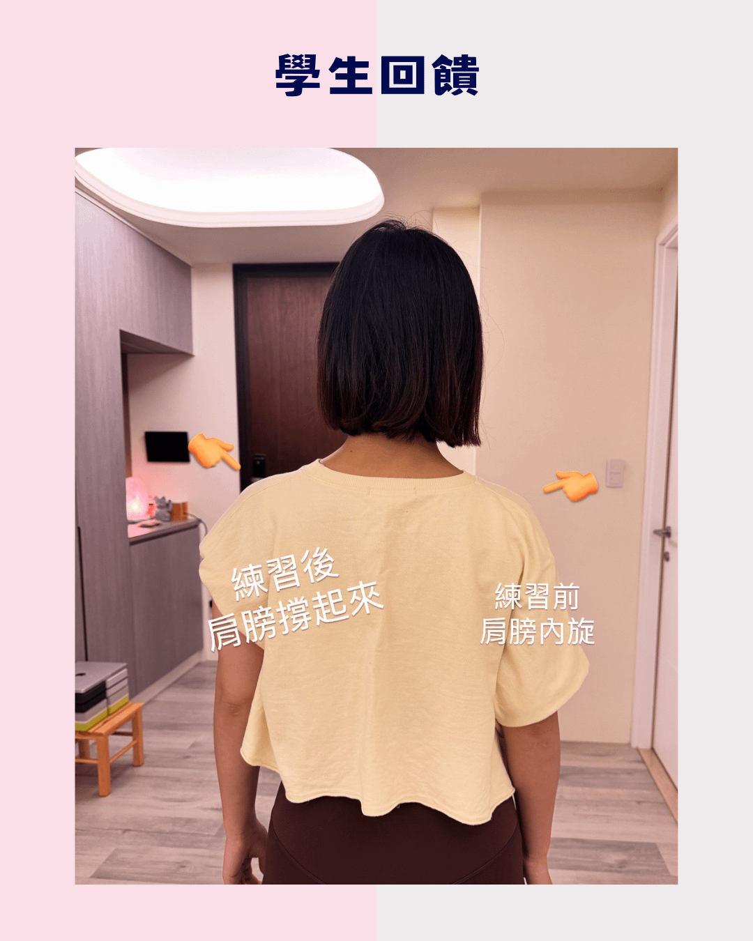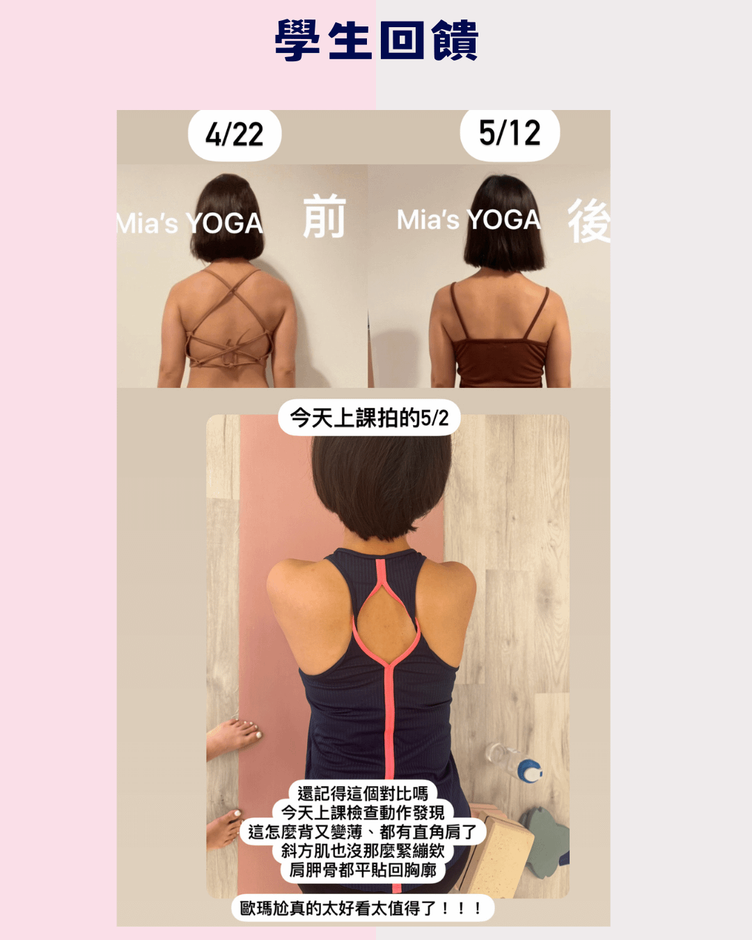 過去的我,把成就感放在拍攝漂亮的瑜珈照、倒立照等等;而現在,我的成就感來自學生們的對比照