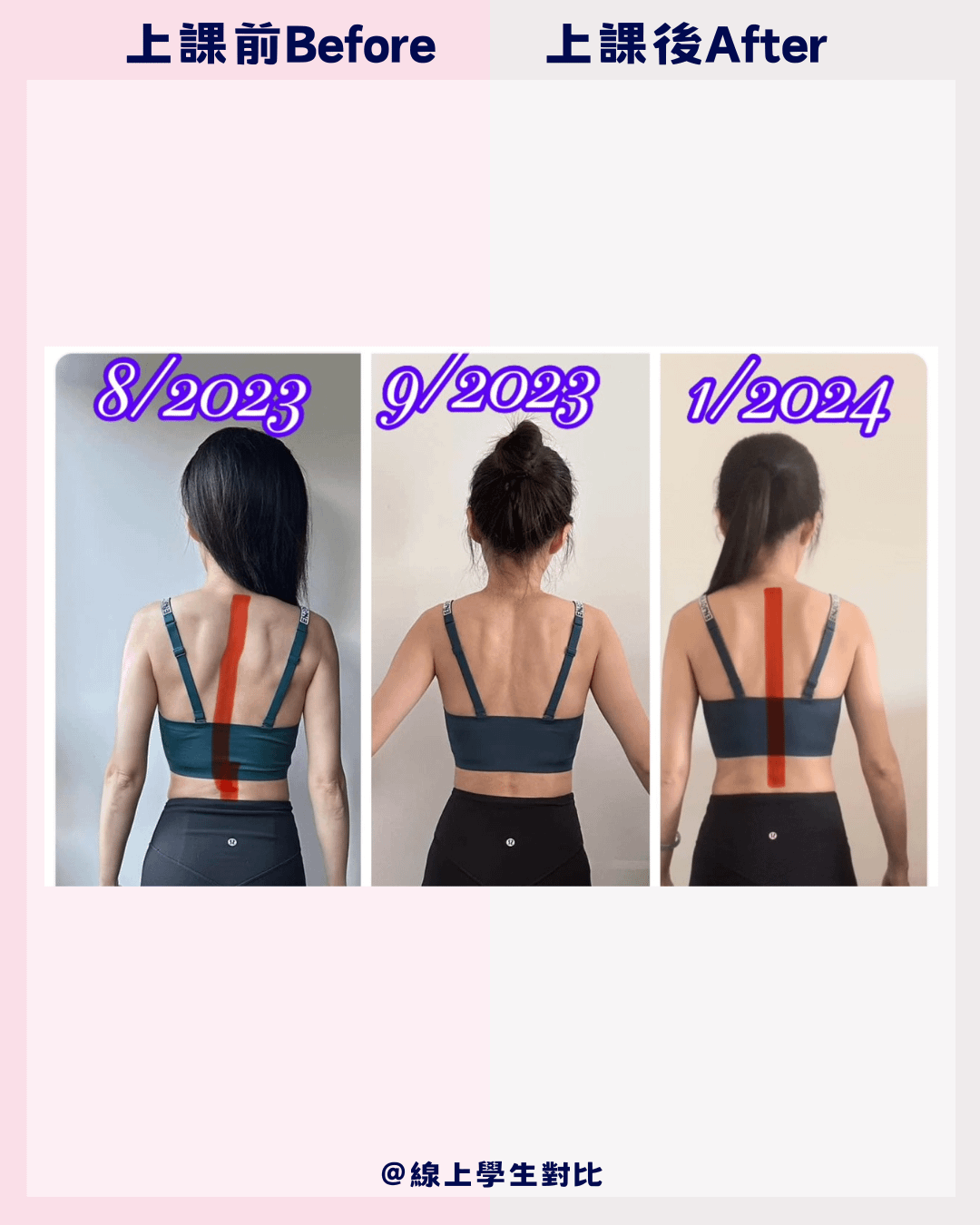 至今,我已幫助超過100+ 位學員,從上半身的肩背到下半身的臀腿,從內而外完成了體態的改變。