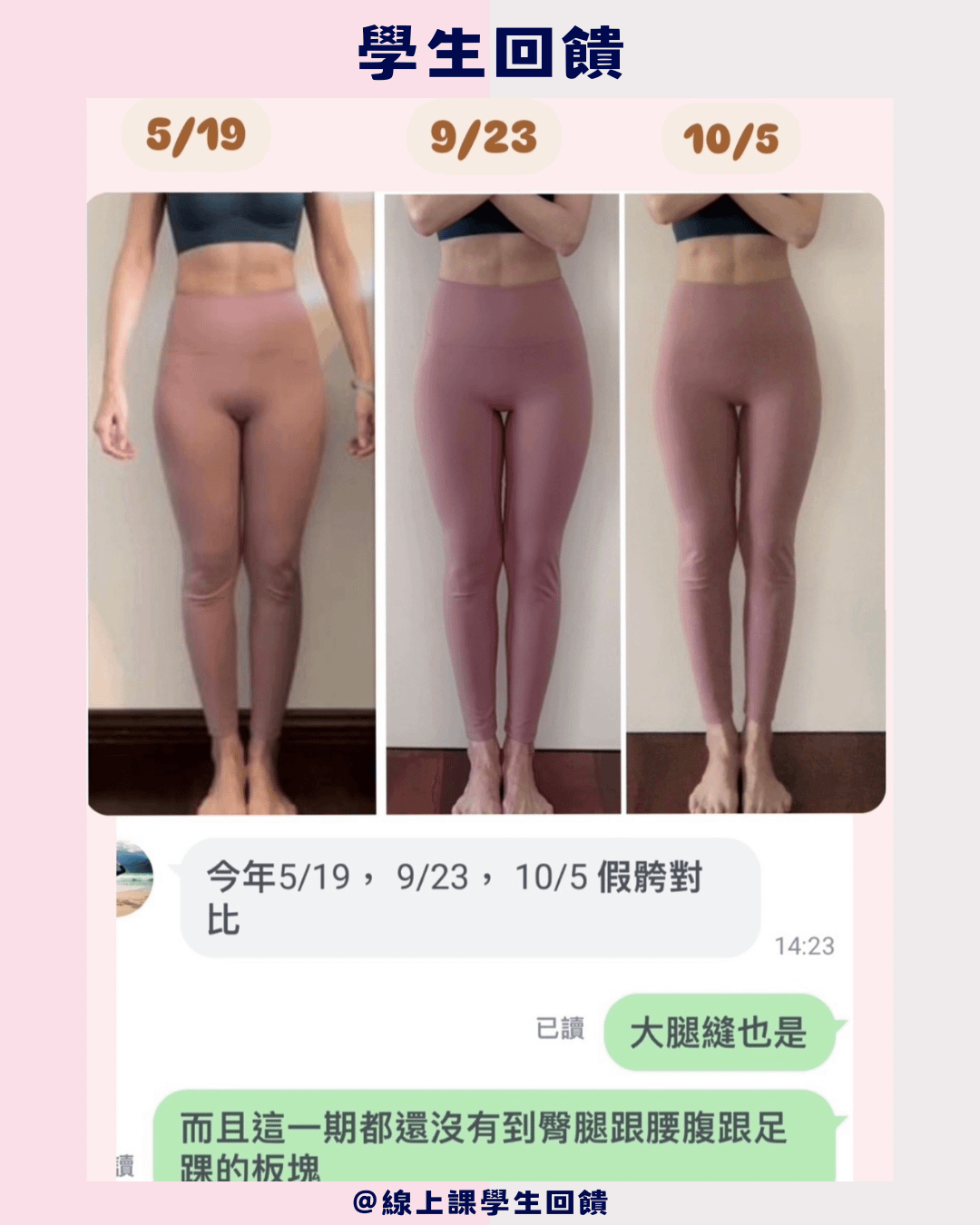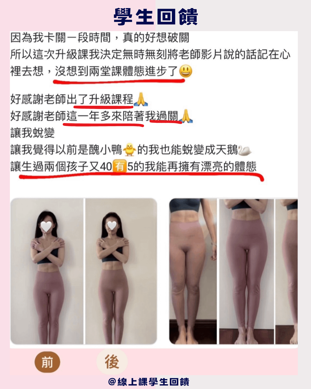 至今,我已幫助超過100+ 位學員,從上半身的肩背到下半身的臀腿,從內而外完成了體態的改變。